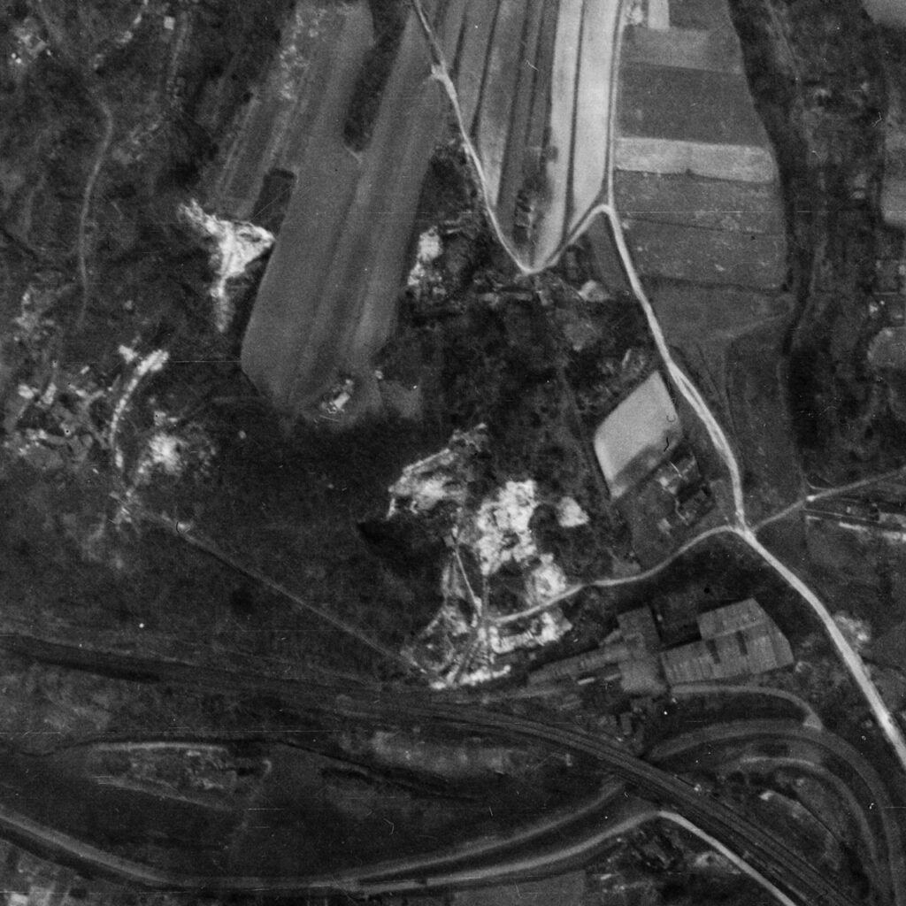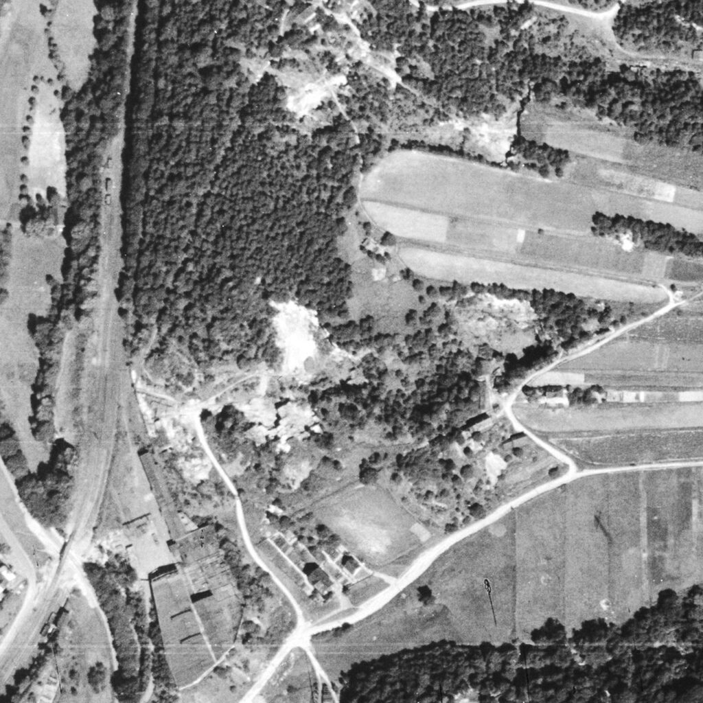 Die Geschichte des Steinbruchs lässt sich eindrucksvoll anhand historischer Luftbildaufnahmen nachvollziehen. Die ersten bekannten Luftbilder stammen aus dem Jahr 1944 und zeigen bereits deutlich das damalige Abbaugebiet. Schon zu dieser Zeit war der Steinbruch klar erkennbar und als prägendes Element der Landschaft etabliert. Das ursprüngliche Abbauareal lag etwas oberhalb der heutigen Abbruchkante und markiert den Beginn einer jahrzehntelangen, kontinuierlichen Entwicklung.